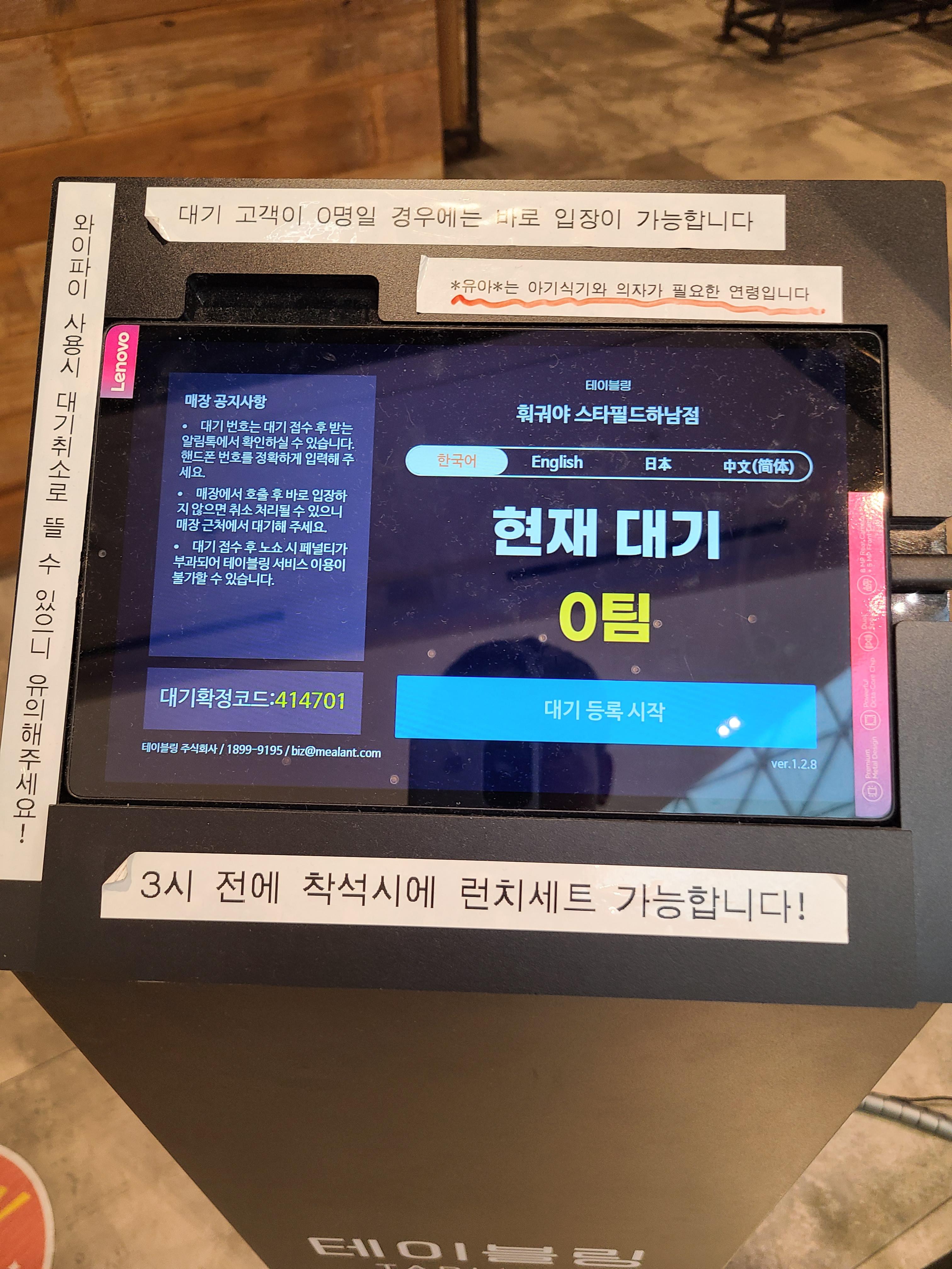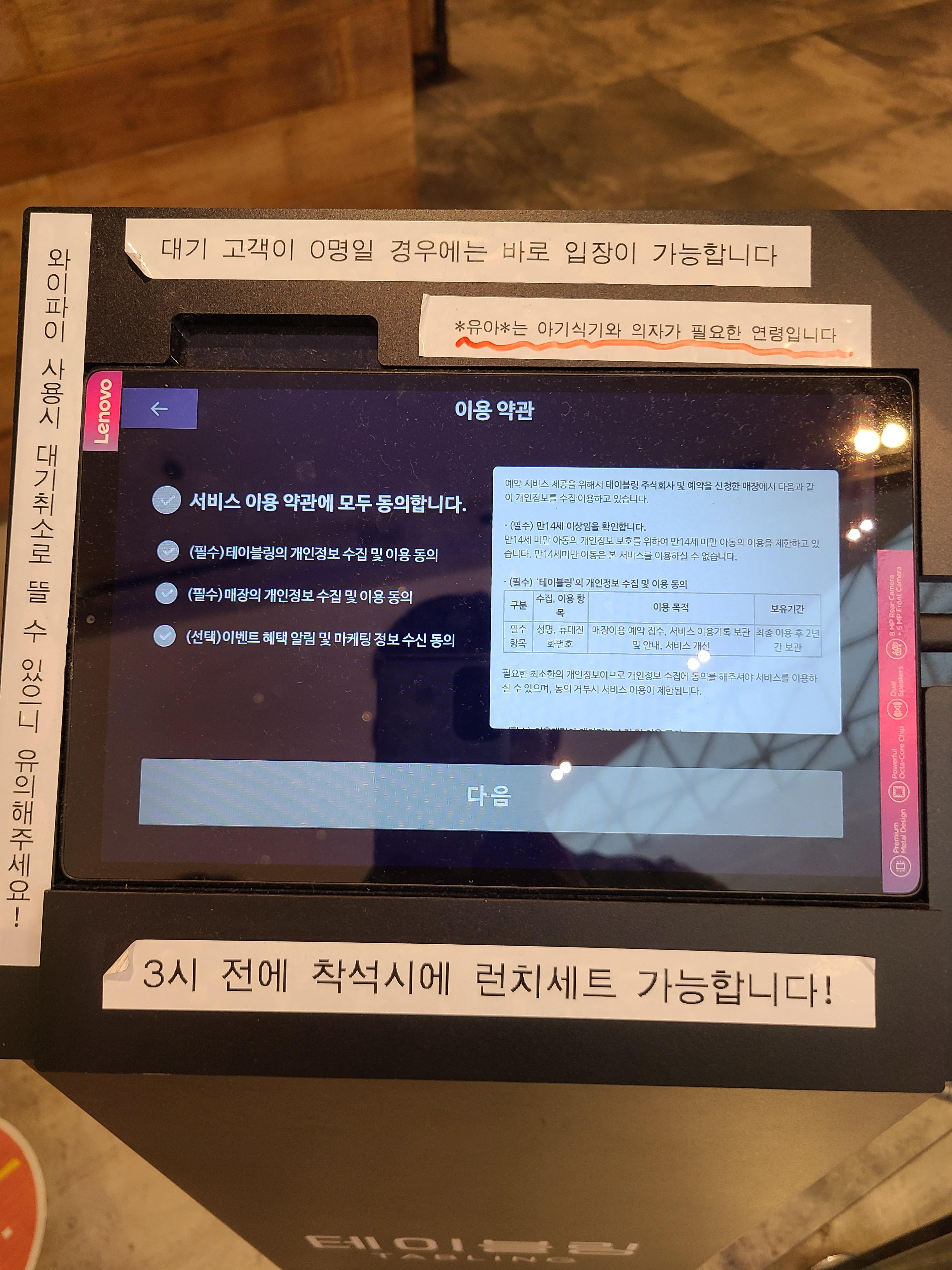 매장입구 테이블링 기계를 통해서 대기를 접수할 수 있습니다. 카톡으로 실시간으로 대기순서를 파악할 수 있어요!