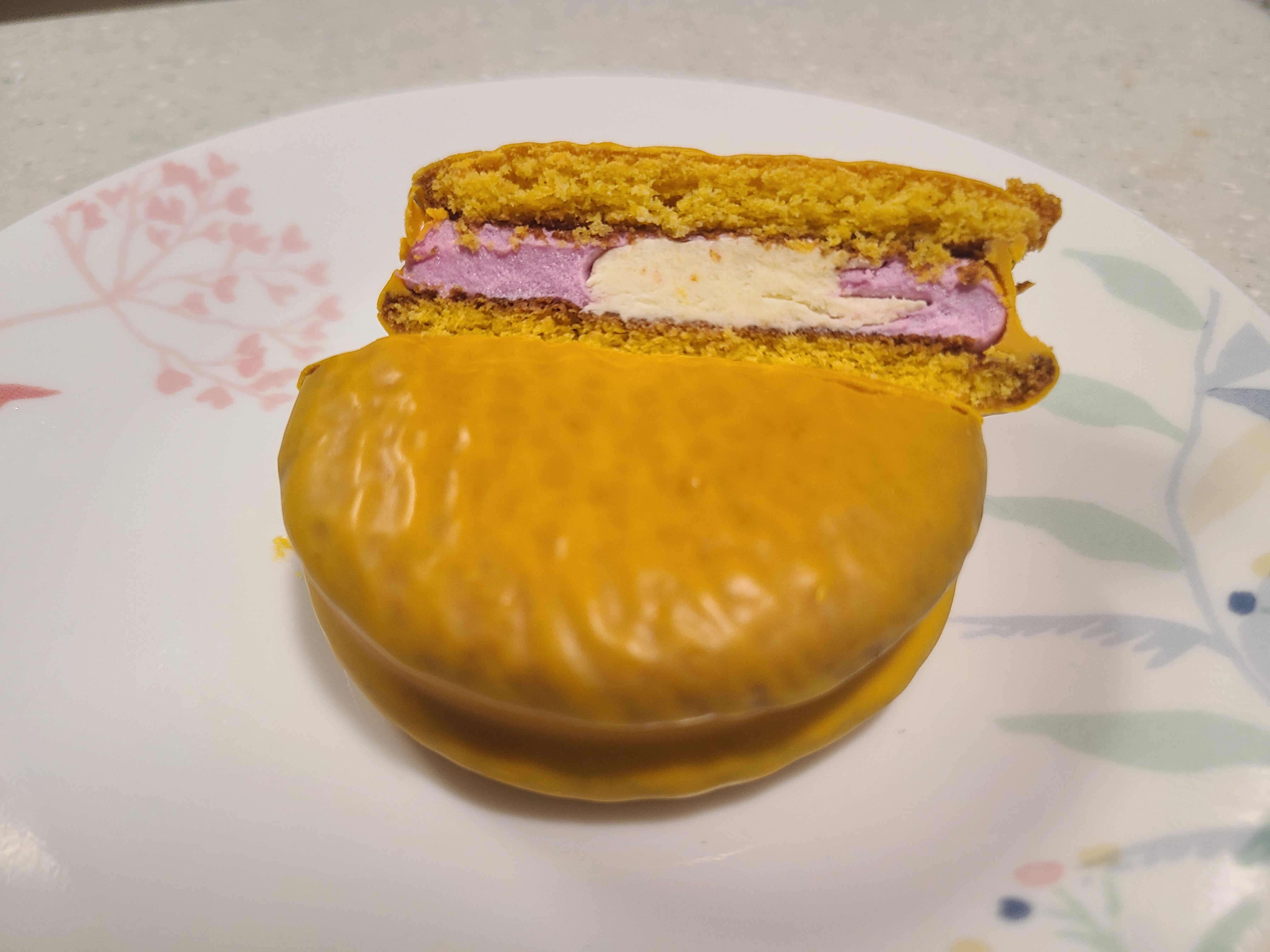 겉은 단호박 케이크 맛이고, 자색고구마를 넣은 보라색 마시멜로우,